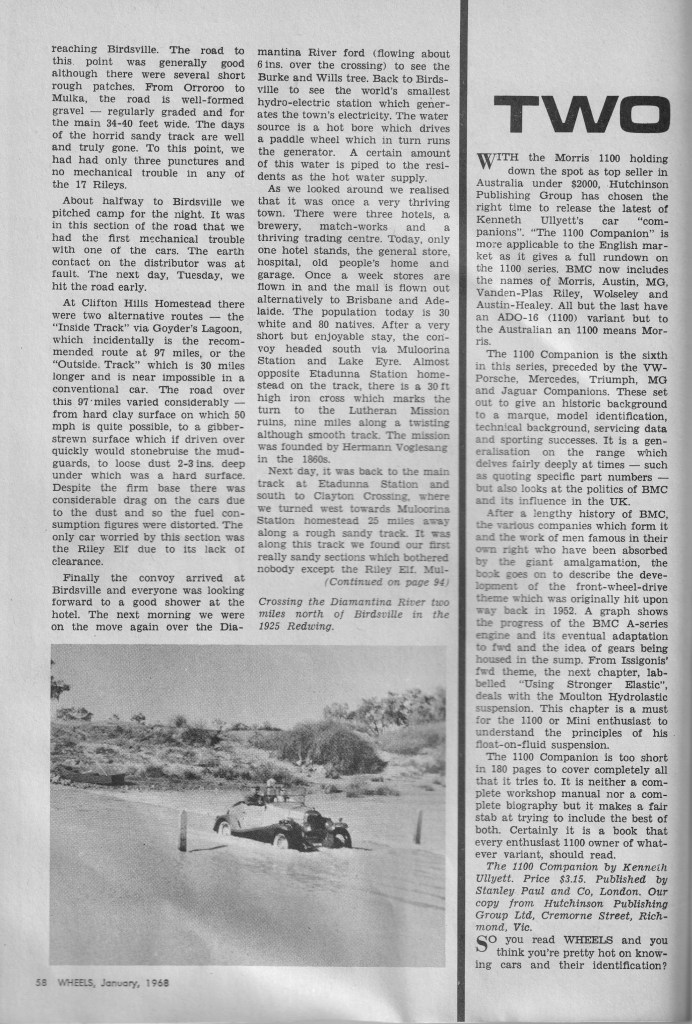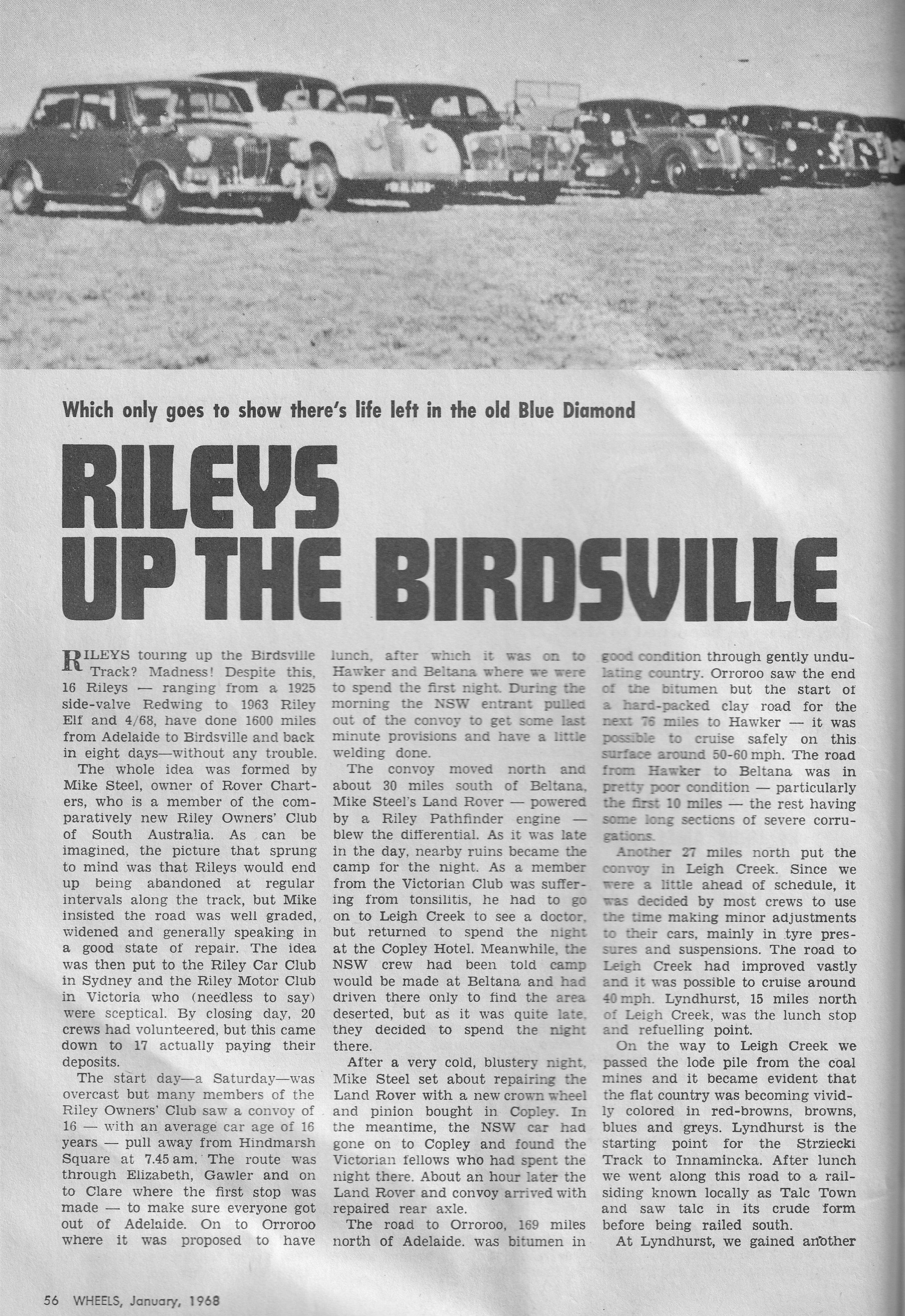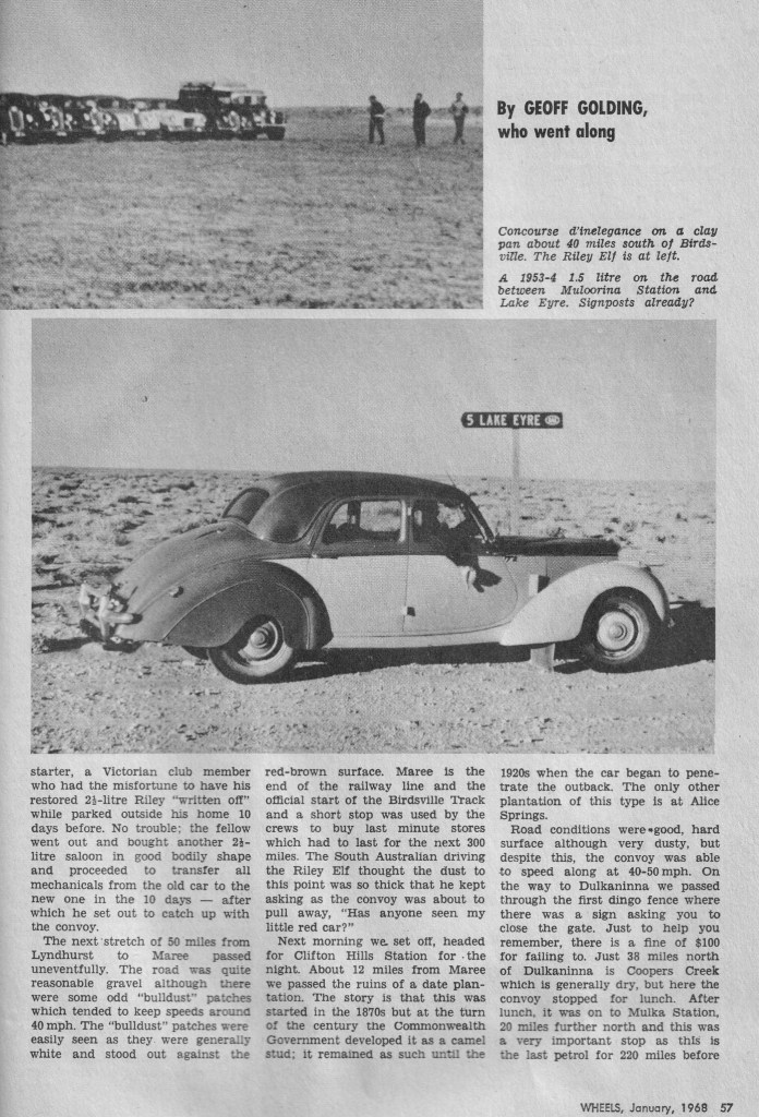 In 1967 a group of intrepid Riley owners ventured inland to Birdsville, in Rileys ranging fom a Sidevalve to an Elf. Even the Support Landrover had a Riley Pathfinder engine. Below is a copy of an article written by former member, Geoff Golding, for the January 1968 Edition of the “Wheels” car magazine. Below this is a link to a YouTube video that Leigh Johnson of S.A. has put up, It is a copy of 16mm film taken by a Channel 9 cameraman who went on the trip. Leigh has edited it, and added a sound track.